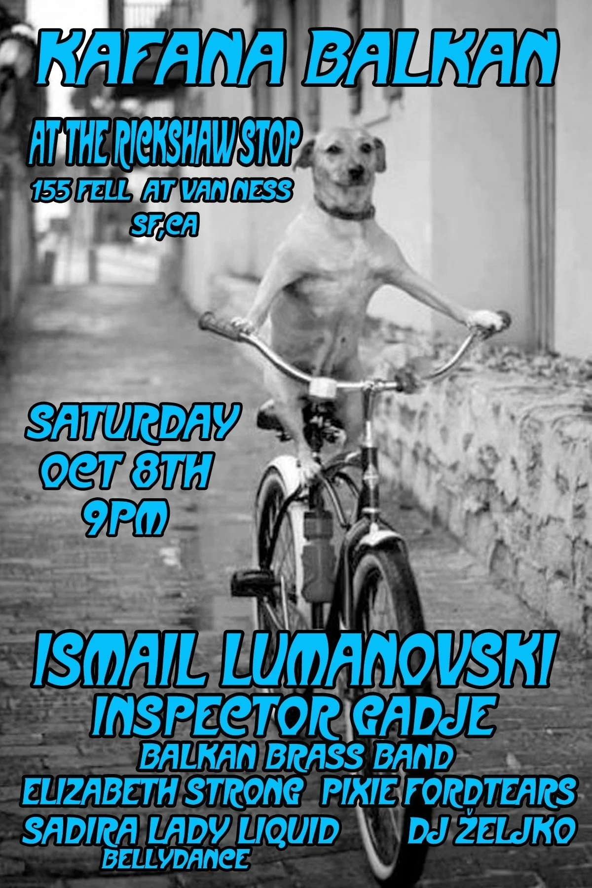 Kafana Balkan will be back Saturday October 8th at the Rickshaw Stop. We’ll be featuring bombastic Balkan Brass with Ismail Lumanovski & Inspector Gadje, Belly Dance by the amazing Elizabeth Strong, Pixie Fordtears and Sadira Ladyliquid. DJ Željko. The dance floor will be hopping!