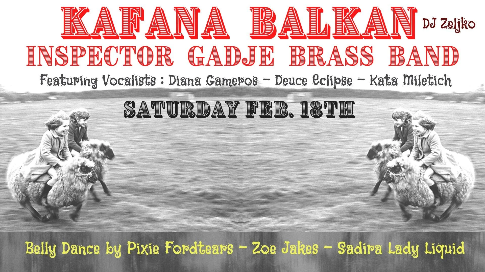 Kafana Balkan presents the bombastic Balkan Brass Band Inspector Gadje Featuring vocalists : Kata Miletich, Diana Gameros & Deuce Eclipse. Belly Dance by the fabulous Zoe Jakes, Pixie Fordtears and Sadira Ladyliquid. DJ Željko. The dance floor will be hopping!