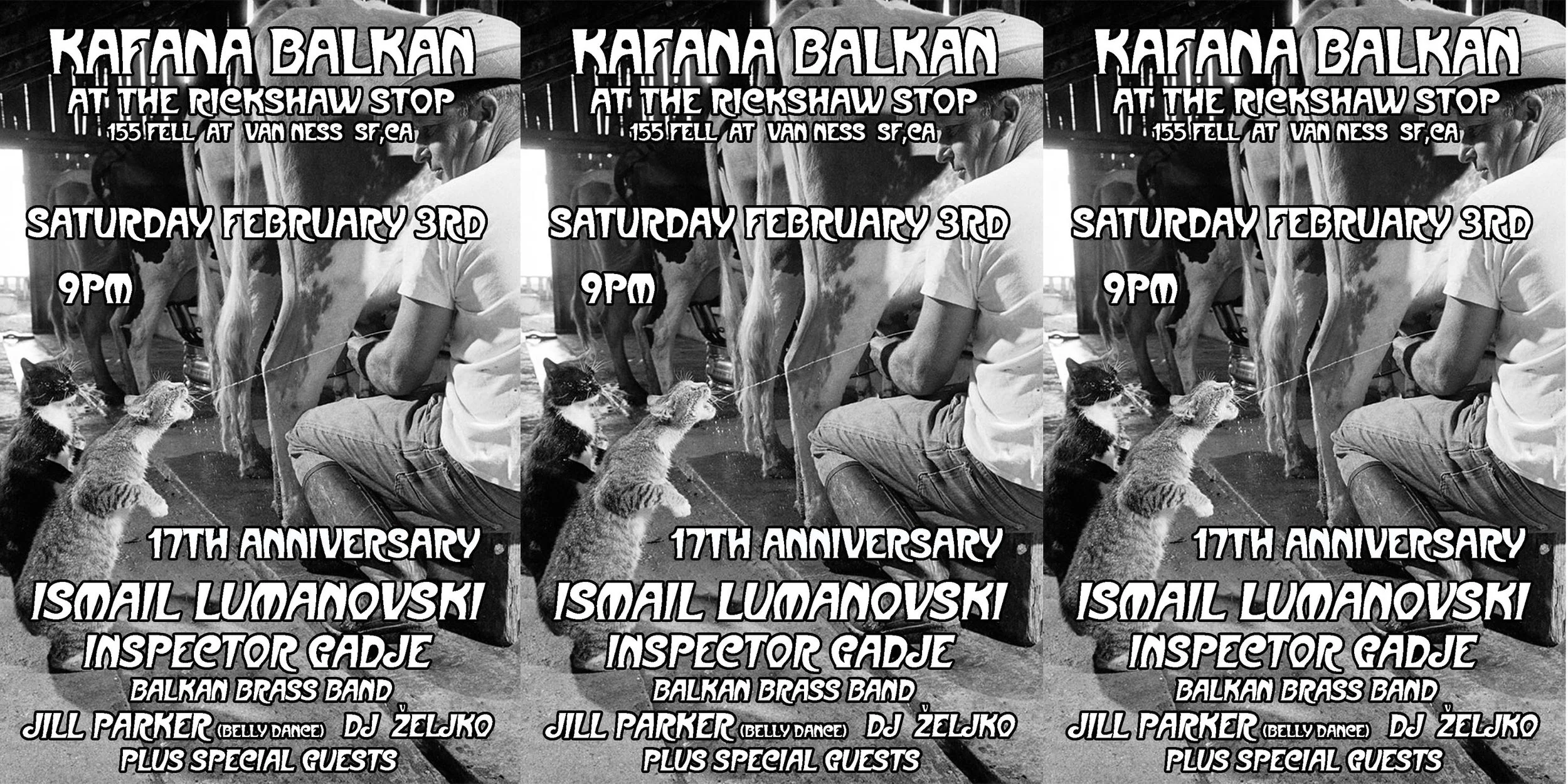 Opa! We will be back Saturday February 3rd with our 17th Anniversary at the Rickshaw Stop. We’ll be featuring bombastic Balkan Brass with Ismail Lumanovski & Inspector Gadje Balkan Brass Band, Belly Dance by the fabulous Jill Parker, DJ Željko and a special opening performance by Stephen and Jay Miles joined by Marco Peris Coppola. The dance floor will be hopping!