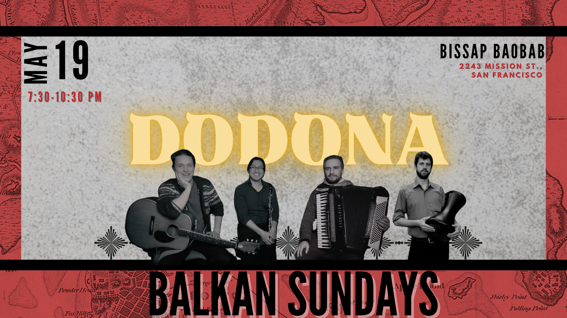 Dipping in the deep well of music from Albania and Epirus in Greece, Dodona moves between the mournful to the celebratory. The members of this new group have a specific goal, to bring out their love for the melodies of this small region. With a repertoire that goes from plaintive, to trance inducing, to driving, Dodona is one of the few groups in the Bay Area specifically focused on the Albanian and Epirus diaspora. So whether you love a good tsamiko, or the familiarity of a syrtos, or even if you just love to dance with wild abandon this unique band is sure to deliver. Dodona’s members are Jonathan Kipp on accordion and vocals, Kent Kissinger on guitar, and Calvin Lai on clarinet. We are also grateful to be joined by Sean Tergis on percussion.
