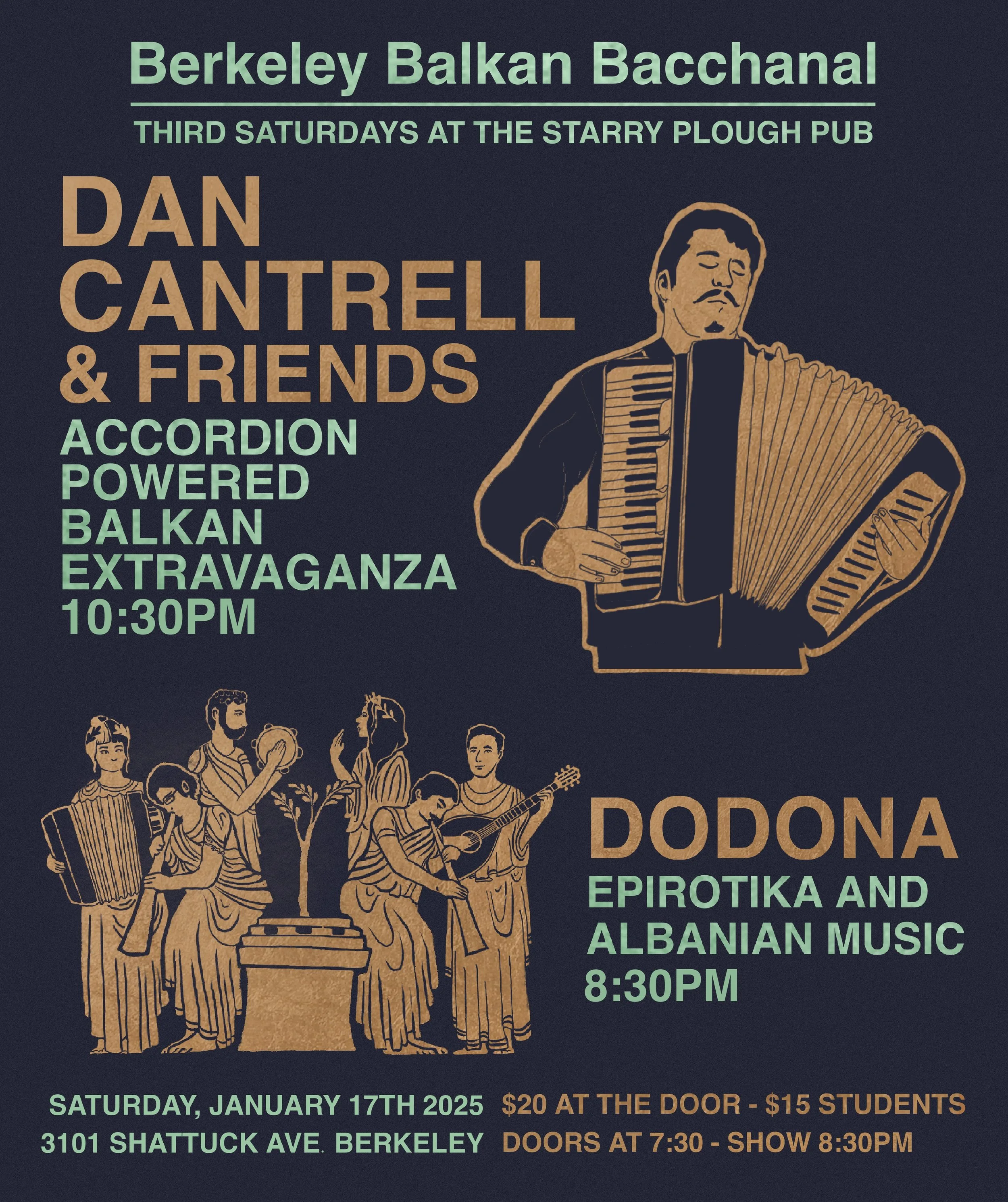 Dodona: Drawing from the deep well of musical traditions from Albania and the Epirus region of Greece, Dodona moves between the mournful to the celebratory. The members of this new group have a specific goal, to bring out their love for the melodies of this small region. With a repertoire that goes from plaintive, to trance inducing, to driving, Dodona is one of the few groups in the Bay Area specifically focused on the Albanian and Epirus diaspora. So whether you love a good tsamiko, or the familiarity of a syrtos, or even if you just love to dance with wild abandon this unique band is sure to deliver. Dodona’s members are Calvin Lai on clarinet, vocalist Genevieve Daphne, violinist Ari Langer, Jenette Selin on accordion, Kent Kessinger on guitar and Sean Tergis on drums plus Greg Jenkins on clarinet and vocals (pending confirmation).