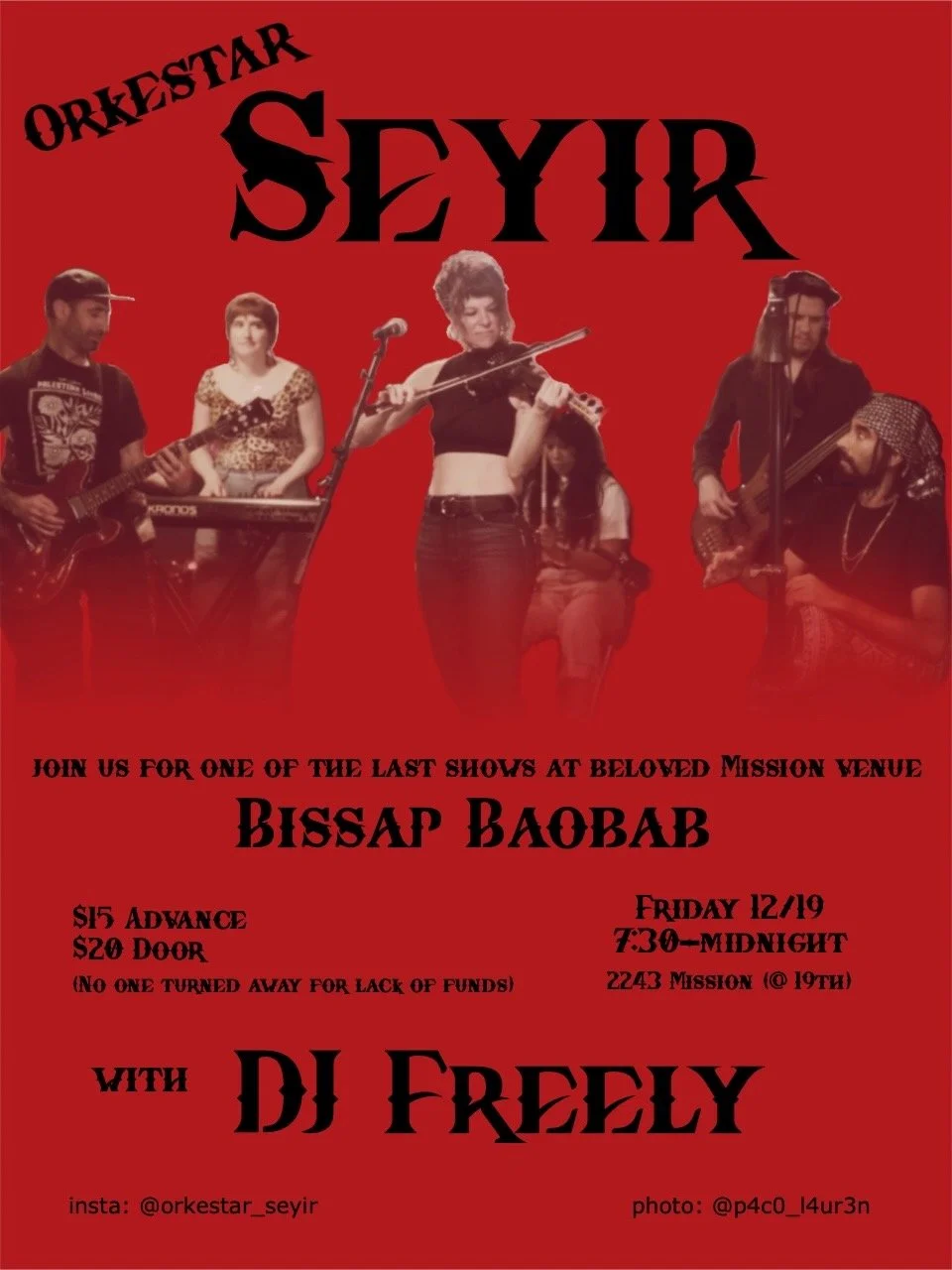 Orkestar Seyir and DJ Freely are throwing a send-off celebration for Bissap Baobab on 12/19 from 7:30–12 PM — and you’re invited to bring the fire.
